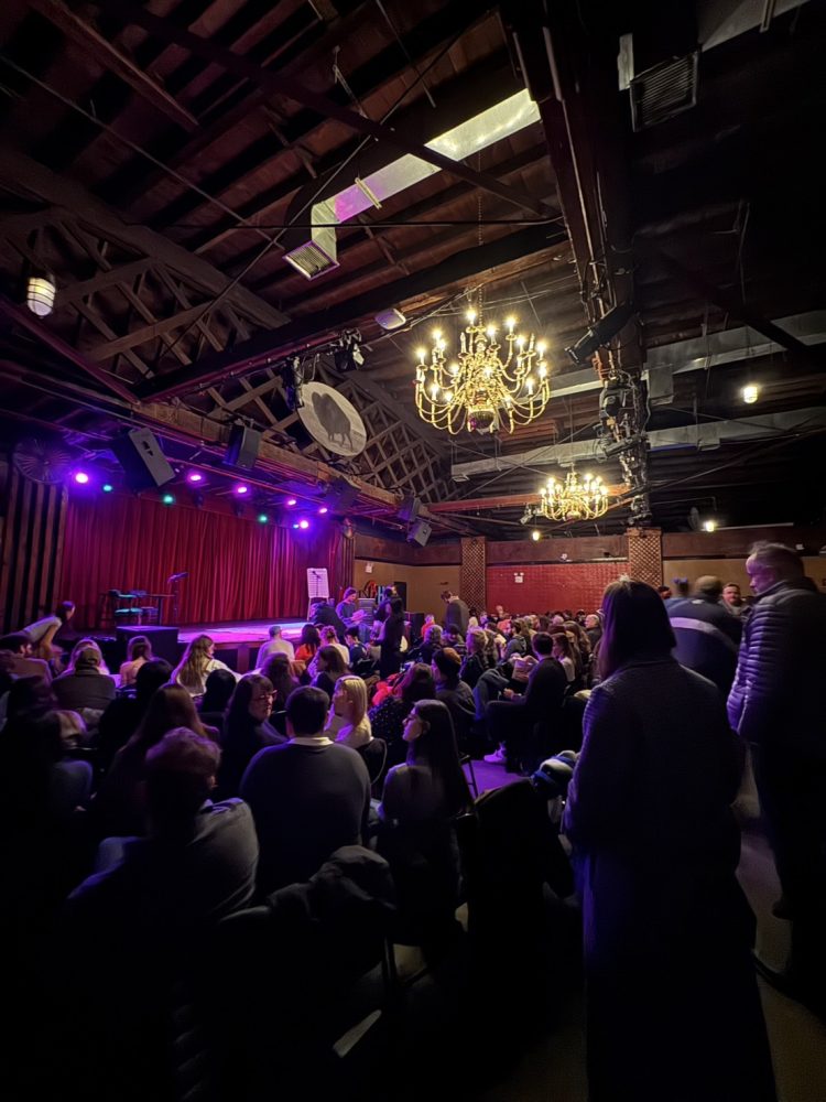 中に入るとさらに圧倒された。映画に出てきそうな洒落たバーラウンジが、人々を迎えている。長いカウンターの奥でバーテンダーが手際よく酒を振る舞っていた。右手には大きなスクリーンもあって、いたるところにコンサートや演劇のポスターが貼られていて活気に満ちている。この奥の廊下を抜けるとメインルーム。今日のイベントが開かれる会場だ。入った瞬間、言葉を失った。アーチ型の高天井から豪奢なシャンデリアが2つ吊るされていて、金色の光が会場全体を包んでいる。鳩と一緒にマジシャンが登場しそうな華やかさだ。